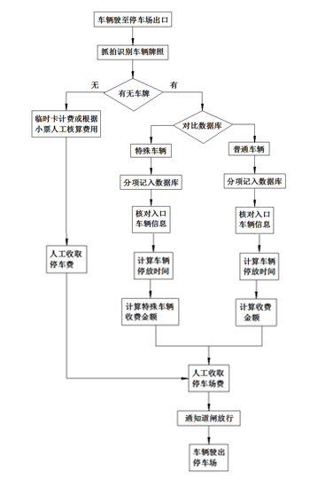 3、車輛越過出口,駛?cè)腚x開停車場,系統(tǒng)記下車輛信息及離開時(shí)間。